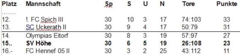 Gegen die Reserve des A-Kreisligisten SV Lohmar konnte unser stark ersatzgeschwächtes Team nur in der 1. Hälfte dank eines sehr gut aufgelegten P. Gnacke im Hüh’scher Tor das Ergebnis noch in Grenzen halten. denn trotz zahlreicher Chancen gelang den Gastgebern erst in der 43. Minute die Führung. Leider verletzte sich unser Torhüter und mußte in der 50. Minute ausgewechselt werden. 6 Minuten später hatte M. Stommel mit der ersten SVH-Chance den Ausgleich auf dem Fuß, doch sein Schuß aus kurzer Distanz verfehlte leider das Tor. Besser machten es dann die Gastgeber in der 60. Minute mit einem direkt verwandelten Freistoß aus spitzem Winkel ins kurze Eck. Mitte der 2. Hälfte nahm sich unser Team eine kollektive 5-Minuten-Auszeit, in der die Hausherren auf 5:0 erhöhen konnten (69./72./74.). In der 81. Minute gelang dann M. Arslan der Ehrentreffer, dem 1 Minute später der Endstand folgte. Mit dieser Niederlage und zudem mit dem schlechtesten Torverhältnis kann man leider in den letzten 3 Heimspielen den Klassenerhalt nicht mehr schaffen.