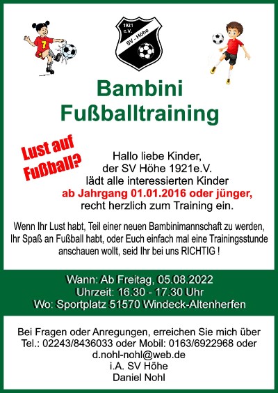 Nächstes Training Freitag, 26.08.22, um 16.30 bis 17.30 Uhr auf dem Sportplatz in Windeck-Altenherfen.