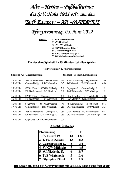 Sonntag, 05. Juni: AH – Turnier um den neuen Tarik Zamzow – Supercup, Platzierungen: